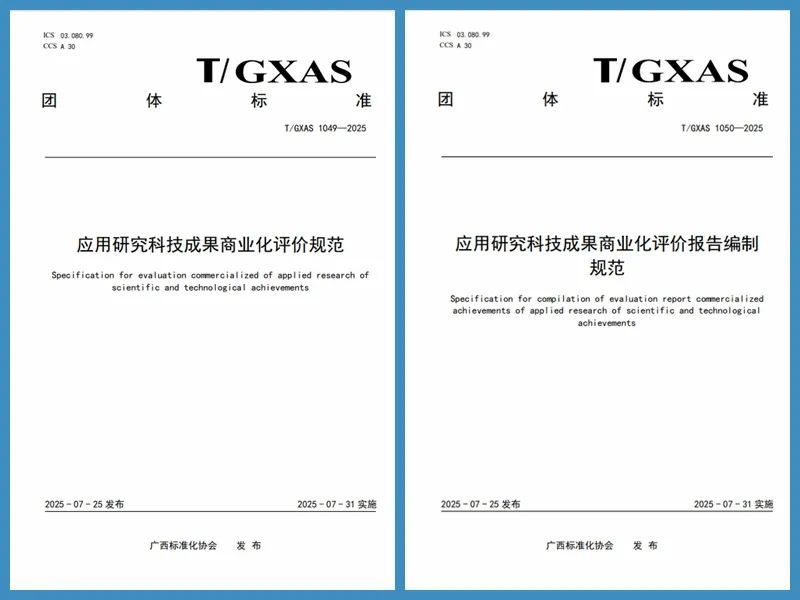 近日,由广西产研院牵头制定的《应用研究科技成果商业化评价规范》《应用研究科技成果商业化评价报告编制规范》两项团体标准正式发布实施,对破解应用研究科技成果转化难题提供了可量化、可操作的评价工具,为加速科技成果商业化提供有力支撑。